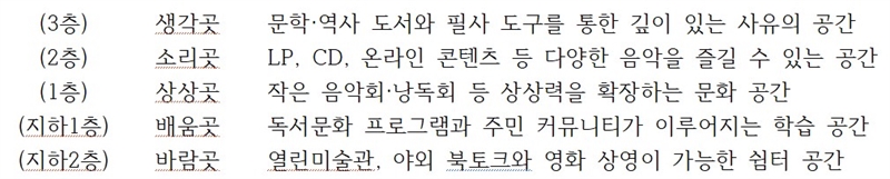 도서관은 연면적 1만2056㎡ 규모로 지하 4층부터 지상 3층까지 총 7개 층으로 구성됐다. 지하 3·4층은 주차장으로 활용되고, 나머지 공간은 모두 시민들에게 개방된다. 내부에는 차별화된 다섯 개의 '곳'이 마련돼 방문객들이 다양한 문화 경험을 누릴 수 있다.